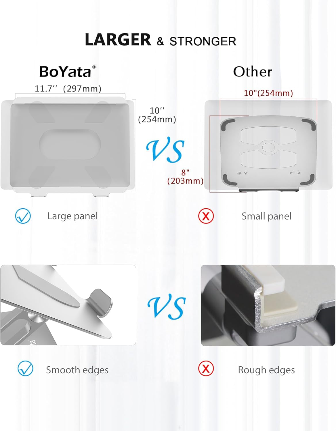 Different from others, the large 11.7*10 inch panel of BoYata N19 laptop stand compatible with all laptops tp to 17 inches. There are 4 non-slip silicone pads on the panel match protective hooks to provide all-round protection.