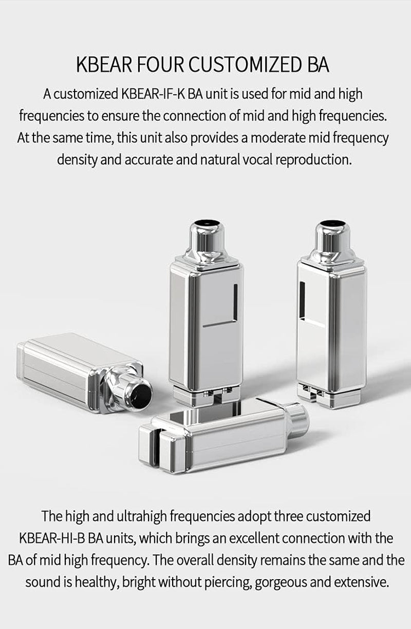 2. he high and ultrahigh frequencies adopt three customized KBEAR-HI-B BA units, which brings an excellent connection with the BA of mid high frequency. The overall density remains the same and the sound is healthy, bright without piercing, gorgeous and extensive.
