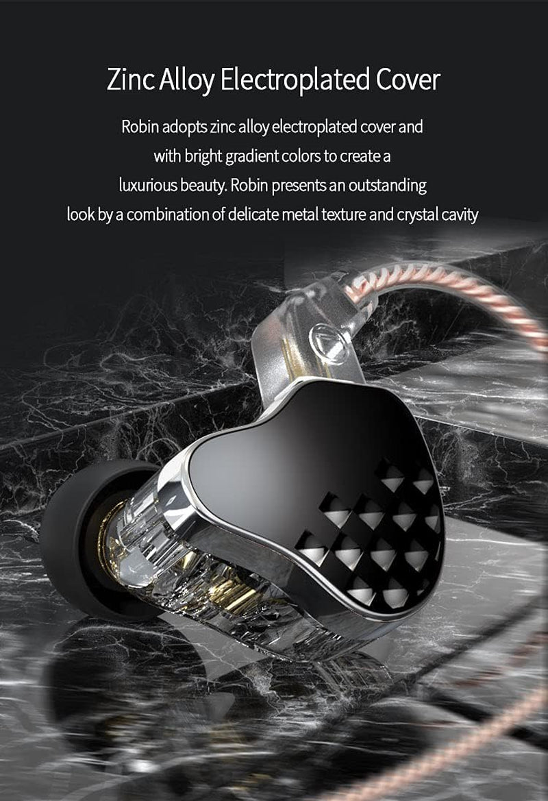 • 【Fashion and Comfortable】KBEAR Robin earbud wired adopts zinc alloy electroplated cover and translucent PC cavity, with bright gradient colors to create a luxurious beauty. Robin presents an outstanding look by a combination of delicate metal texture and crystal cavity. Based on the big data of auricles and ear canals, it adopts earhook design. The cable is attached with a memory tube earhook, which ensures a good fit, not only elegant but also comfortable.